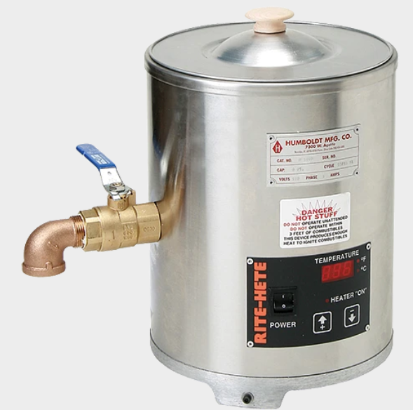 Round, melting pot has stainless steel crucible (18 gauge) and shell (20 gauge) to facilitate easy clean up. Choice of 6 quart, or 12 quart models. Includes heavy-duty, adjustable bench mounting stand, which fits either size. Dual-point temperature control allows independent temperature for pot (0-350°) and for valve (1-10°). Digital display may be read in either Centigrade or Fahrenheit. Other features include: multiple-circuit blanket heater for very uniform heat; no-drip 1" ball valve dispenser, 7.25" (184mm) above work surface; 50-watt valve heater; 3" (76mm) fiberglass insulation; separate aluminum cover; 6' power cord.