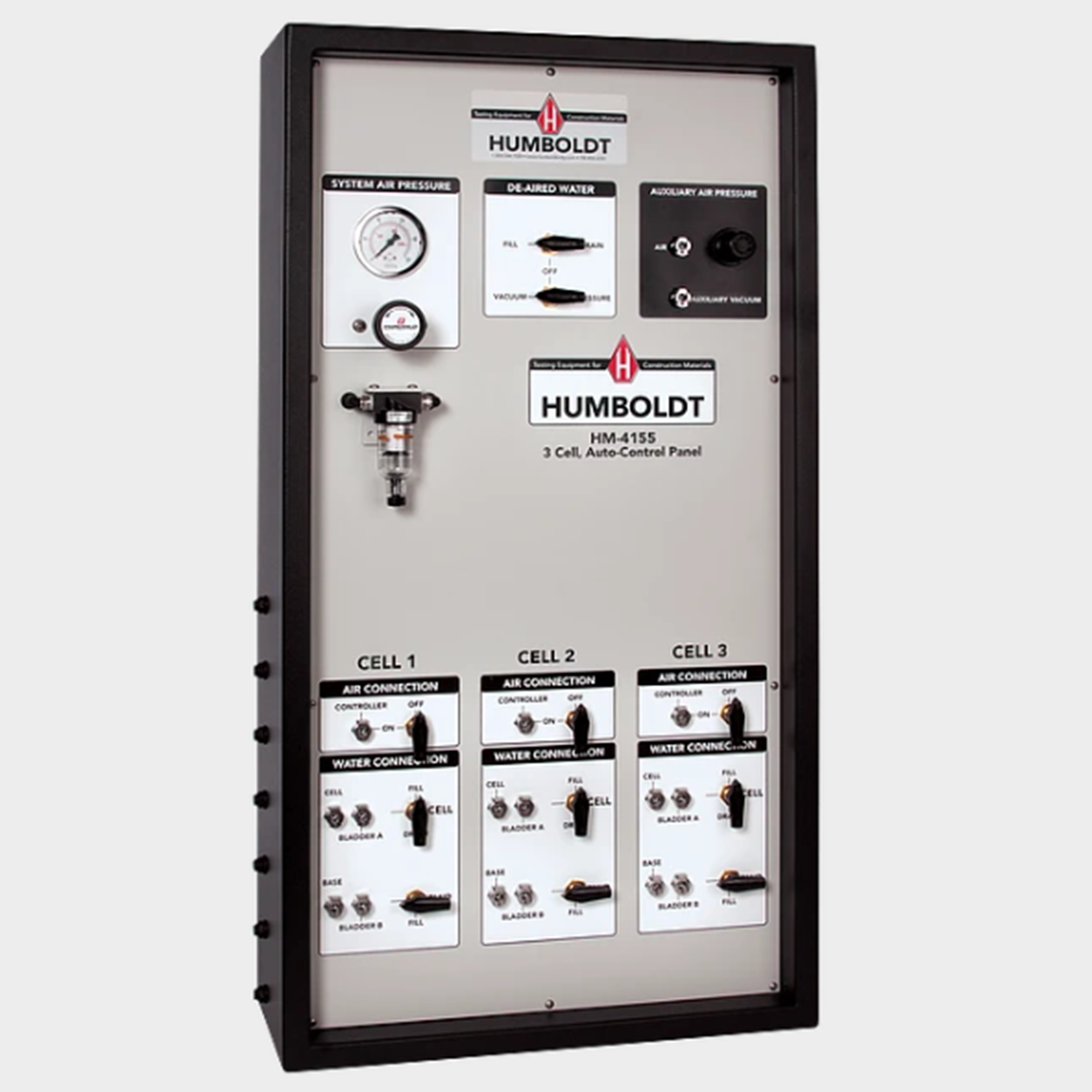 Used in conjunction with the HM-2450A.3F Pressure Controller, Humboldt Automated Control Panels provide an accurate and easy-to-operate solution for providing the controls necessary for distributing compressed air, water, deaired water and vacuum within an air/water bladder-type triaxial testing system. The use of these Control Panels and the HM-2450A.3F Pressure Controller allows changes in cell and back pressures required for sample saturation to be done automatically without the need for an operator. This feature reduces the need for continual monitoring of the sample saturation process during a triaxial test.