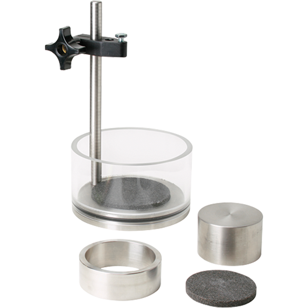 Basic Swell/Expansion Consolidometer for accurate soil swell and expansion tests. Includes stainless steel base, acrylic ring, porous stones, and 60 psf loading weight. Compatible with H-4471 and H-4465.12 dial indicators.