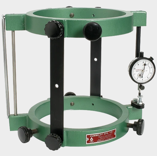 The compressometer is used for evaluating the chord modulus of elasticity (Young's modulus) of concrete cylinders while undergoing compression testing. The compressometer includes two, cast-aluminum alloy yokes, mounting and central points, stainless steel control rods. Models are available with a dial gauge— with a range of 0.2" (5.08mm) and minimum graduations of .0001 (.0025mm), as well as with a digital indicator or a LSCT transducer. Digital indicators and LSCT models can be used with data acquisition systems through the use of our miniloggers.