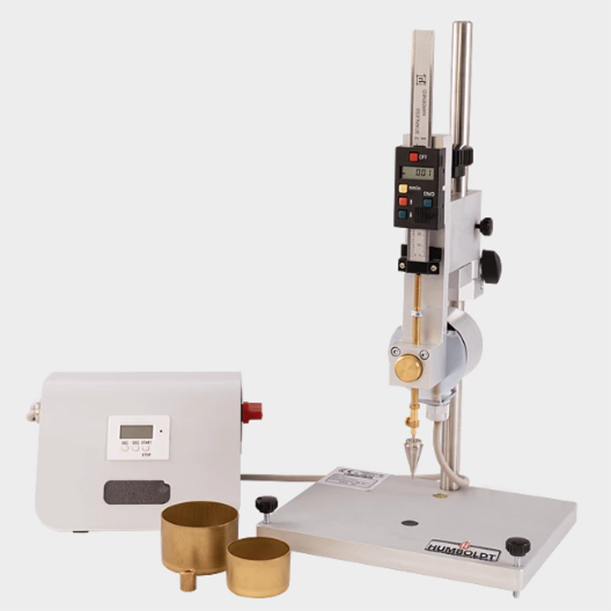 The H-5237 semi-automatic cone penetrometer is equipped with a magnetic controller device with an electronic, digital, programmable timer that automatically releases the plunger head and ensures free falling of the cone during the five second test. The digital readout provides readings in 0.1mm resolution in either mm or inches. The chromed support rod features micro-metric vertical displacement for accurate positioning with a brass slider that provides smooth free fall, a stop and release button and an automatic zero set. Includes a stainless steel penetration test cone: 35mm long with a 30° angle and a 20g surcharge weight. Two brass cups are included (55 x 35mm and 70 x 45mm) This cone penetrometer can also be used to measure the shear undrained strength of undisturbed and reconstituted soil samples per CEN ISO/TS 17892-06. Overall dimensions are: 8.6" x 6.7" x 16.1" (220 x 170 x 410mm).