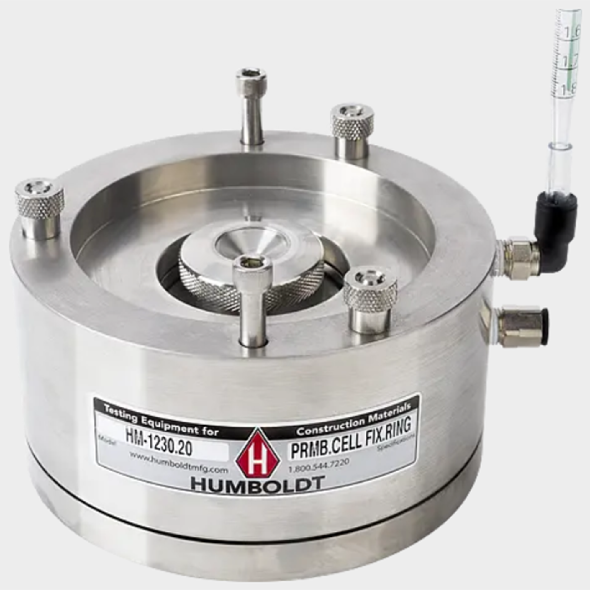 The Consolidation, Fixed-Ring Permeability Cell is similar in construction to a fixed-ring cell with the exception that the saturated sample and water are sealed from the atmosphere. Complete cell assembly features stainless steel construction and self-trimming cutter ring. Base features outlet port and 10cc pipette for monitoring water level. The cell comes complete with a pipette.