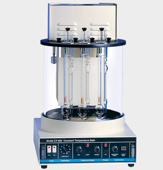 These baths maintain accurate temperature control of ± 0.01°C within the range of 20°C to 100°C (±0.01°C), providing the temperature sensitivity required by ASTM D445 for kinematic viscosity measurements with glass capillary viscometers. Two electric heating elements inside the bath rapidly heat the medium to any desired temperature within the range.