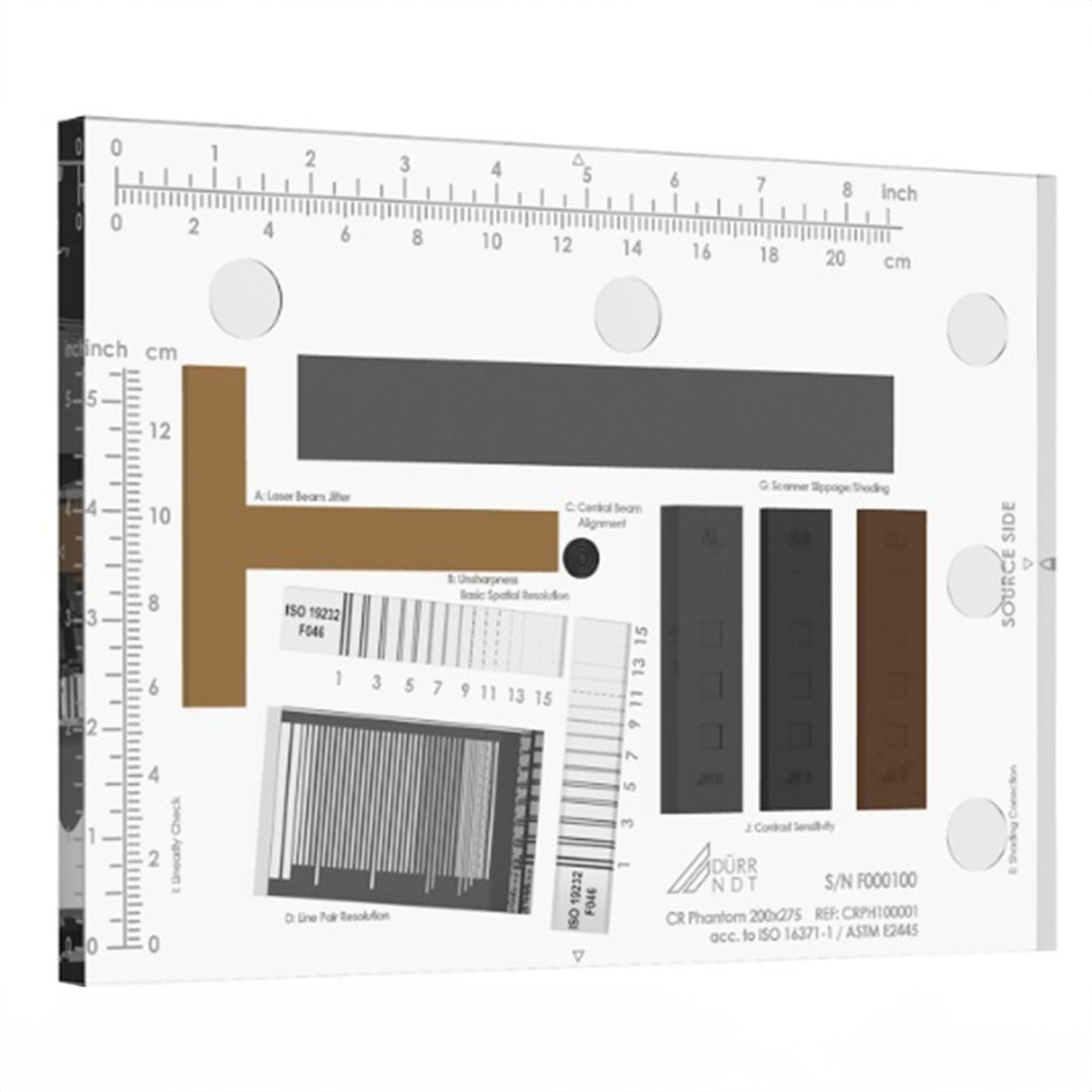 To meet the requirements of these standards, the Dürr NDT CR Phantom contains two 15D duplex wire type IQI’s along with measuring points for shading correction in both horizontal and vertical directions. This allows all the required information to be captured on the imaging plate with a single X-ray exposure, as the CR Phantom does not need to be rotated.