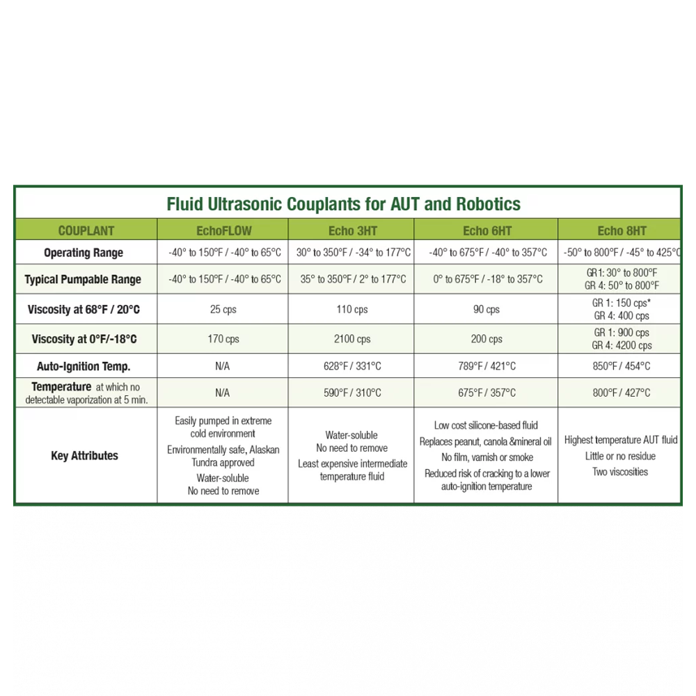 Use the fluid selection chart below to identify the Echo Ultrasonics fluid UT couplant that best matches your application and performance requirements.