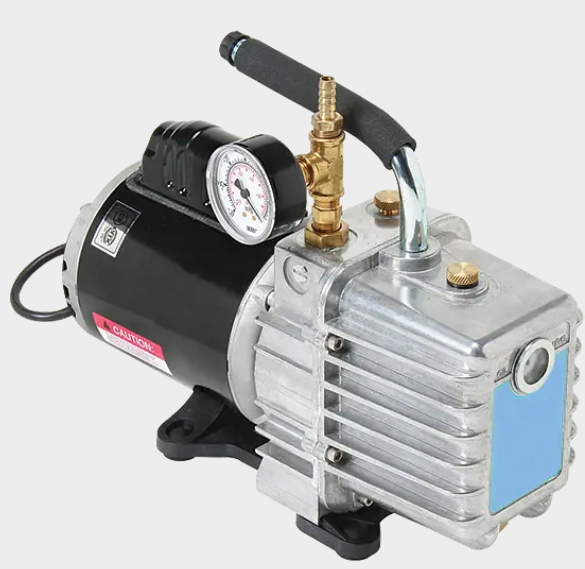 Direct-drive two-stage rotary sliding vane high vacuum pump features gas ballast and trap to reduce risk of oil being sucked into the system. Produces free air displacement 85L per minute (3 cu. ft. per minute) and maximum vacuum 29-30". Operating temperature is 30 to 170°F (-1.11 to 76.6°C). Has 0.25" OD intake ports for 0.25" ID tubing.