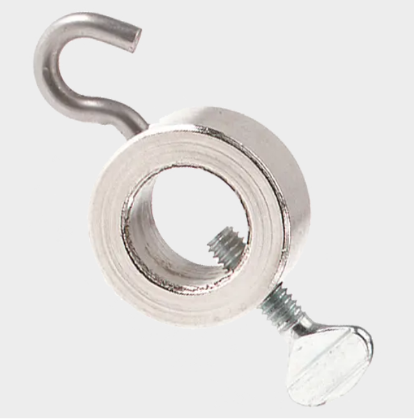 Hook Collars are used for attaching pulleys, balances, cords, trusses, pendulums, and other apparatus to support rods. The collars are plated for corrosion resistance and are supplied complete with thumbscrew and hook.