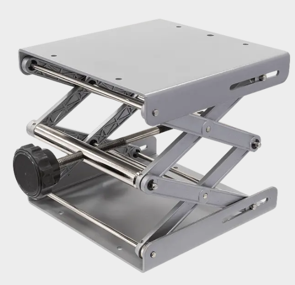 This highly stable jack can be adjusted to any height between 2-1/2" to 10" (64mm to 254mm). The jack will accept loads up to 10 lbs. (45.4 kg). The unit is constructed of aluminum top and bottom plates with a baked-enamel finish and plated steel cross members. Height adjustments are achieved by means of a threaded rod attached to a large serrated knob.