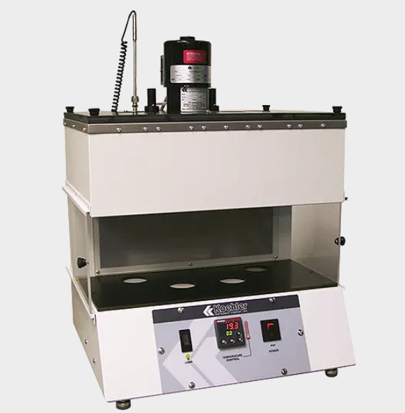 Simple push-button controls and dual digital displays are used for easy setting and monitoring of the bath's temperature. With a capacity of four viscometers and 60ml receiving flasks, the bath features sliding draft shields, chemical-resistant alignment plates for handling of flasks and a glare-free fluorescent backlight for easy viewing of test sample. The insulated bath interior is constructed entirely of heavy-gage stainless steel and the built-in overflow pipe and drain valve simplifies filling the bath oil to the required level. A chemical resistant top plate provides insulation and is easily removed to allow for cleaning of the bath interior.