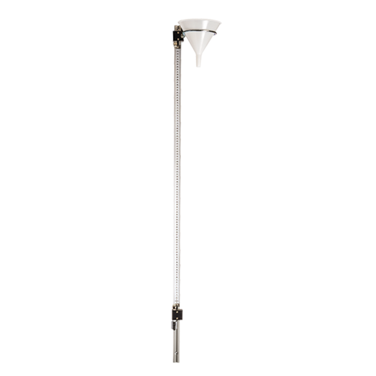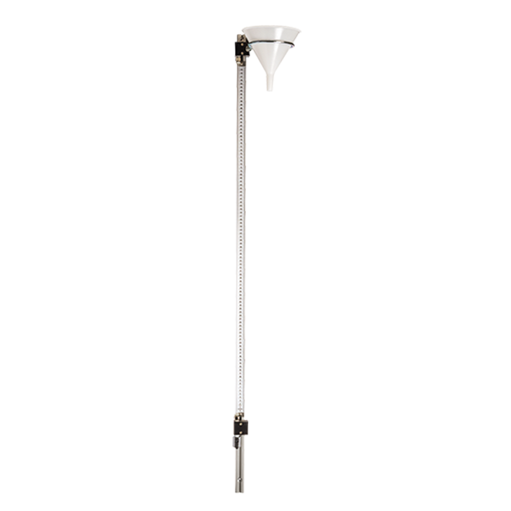 Economical manometer tube setup designed for use with Falling Head Cells. This setup features a single acrylic tube with valves mounted on an aluminum rail, complete with a scale for monitoring flow volumes. The scale is 100 cm long and includes graduations in centimetres and millimetres. You can select either a wall mount or a free-standing option. The package also includes a funnel and tubing.