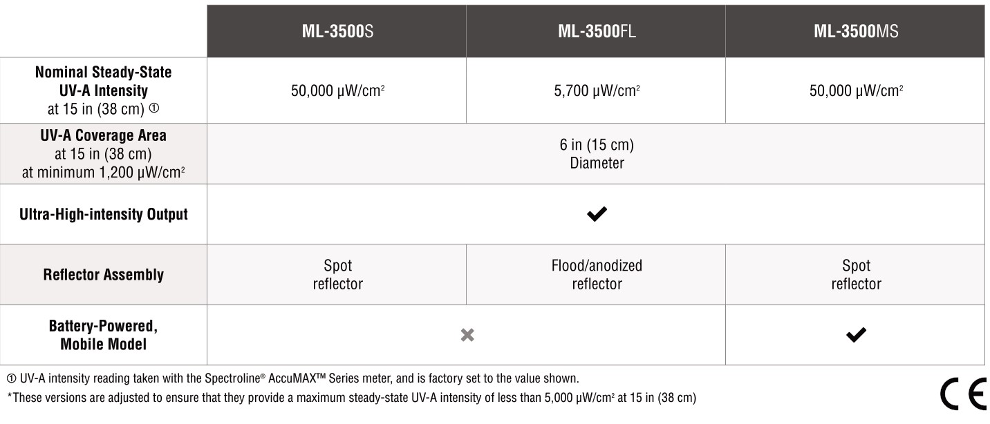 These super-powerful MAXIMA™ 3500 SERIES lamps make NDT inspections easy. They feature micro discharge light (MDL) technology with a fatigue-free ergonomic design. Deliver up to 10 times the UV-A output of conventional HID inspection lamps. They have a lightweight, solid-state ballast and integral bulb/reflector assembly. Stay-cool, impact-resistant and dent-proof housing. Prefocused at the factory.