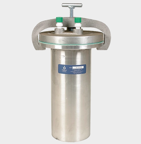Used primarily in standards for determining water in crude petroleum, tars and derivatives of those materials. Large model, 3.75" x 9.5" (95mm x 241mm) ID, has three tubulures, two drilled 10/18 and one drilled 24/40). The small model, 3.5" x 6" (89mm x 152mm) ID, has a 1 qt, (0.95L) capacity and one tubulure. Both are cast aluminum.