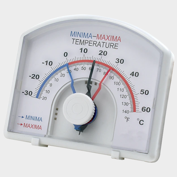 Thermometer indicates present, highest and lowest temperature since last indices setting. Indices are easily reset after each reading.
