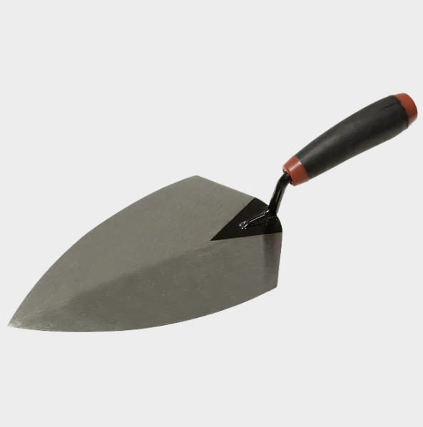Forged steel trowel for mixing cement batches, filling molds, etc., has flat pointed blade and rubber/plastic handle. Dimensions: 5.25" x 10" (133 x 254mm)