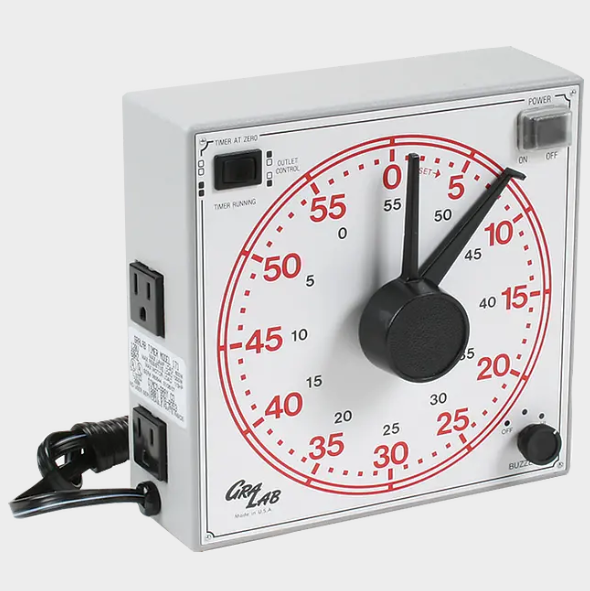 Additionally, it has a selective automatic buzzer alarm. The timer comes with two separate outlet receptacles for the automatic switching of external appliances. A toggle switch controls one outlet, allowing the circuit to be engaged or disengaged at "0." The circuit on the second outlet automatically breaks after the specified time interval. The shipping weight is 6 lbs (2.7 kg).