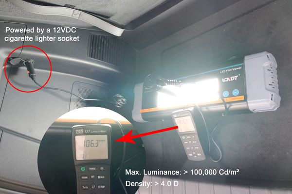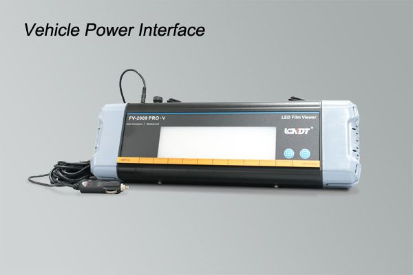 The FV-2009 PRO-V is designed for use in vehicles and the field. It can be powered either through the 12V car cigarette lighter socket or used with a 110V-220V AC power supply. This allows it to be conveniently connected directly to a vehicle without the need to purchase an additional and expensive inverter. Since the device is fully sealed, it is waterproof and can be used to view wet films directly. Equipped with ultra-bright LED chips, it is